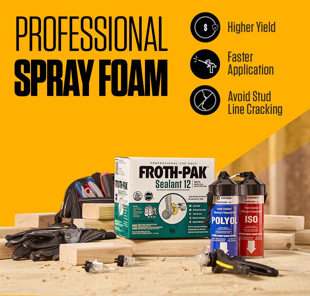 Froth-Pak™ Sealant 12 is the all-in-one, self-contained and easily portable kit for professional contractors to "picture frame” wall cavities and other small areas that require sealing quickly and efficiently. This two-component foam seals out moisture, dust, allergens, and pests while improving energy efficiency, and our newly reformulated product delivers a GWP reduction of over 99%. Our new Froth-Pak™ Sealant Spray Foam contains no ozone-depleting chemicals or HFCs while elevating the performance attributes you have come to expect.