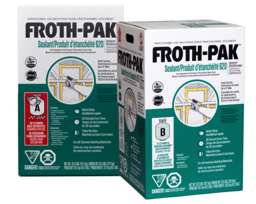 Froth-Pak™ Sealant 620 is a two-component, quick-cure polyurethane foam that can be used to "picture frame" cavities and to fill penetrations and cracks up to 2” thick by 4” wide. Froth-Pak™ Sealant is a chemically cured foam designed to significantly reduce curing time. It dispenses, expands, and becomes tack-free in seconds, saving pros time on the Jobsite.
