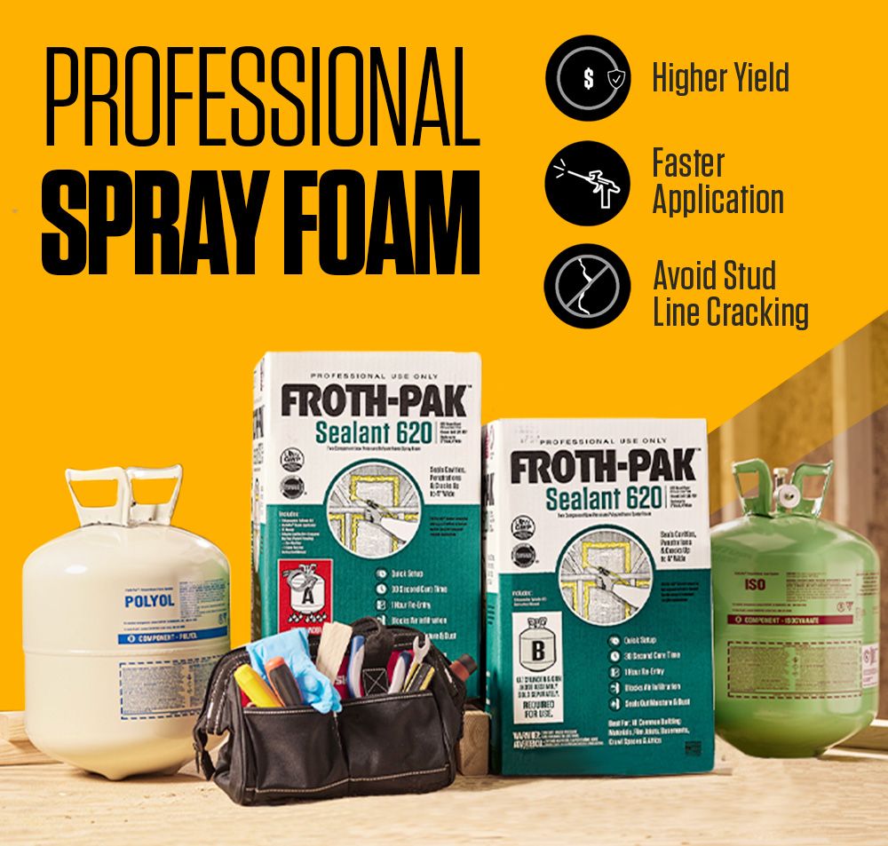 Froth-Pak™ Sealant 620 is the all-in-one, self-contained kit for professional contractors to "picture frame” wall cavities and other small areas that require sealing quickly and efficiently. This two-component foam seals out moisture, dust, allergens, and pests while improving energy efficiency, and our newly reformulated product delivers a GWP reduction of over 99%. Our new Froth-Pak™ Sealant Spray Foam contains no ozone-depleting chemicals or HFCs while elevating the performance attributes you have come to expect.