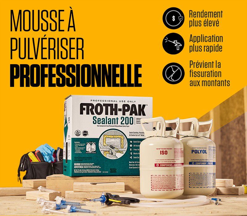 Froth-Pakᴹᶜ 200 est une mousse de polyuréthane à deux composants et durcissement rapide utilisée pour sceller les cavités par encadrement et combler les pénétrations et fissures dans les solives de bordure, les jonctions murs/toit et autour des tuyaux et des conduits jusqu'à une profondeur de 2 po. Comme la mousse Froth-Pakᴹᶜ est durcie chimiquement, son temps de durcissement est considérablement réduit. Elle s'applique, se dilate et devient non collante en quelques secondes, ce qui permet aux professionnels de gagner du temps sur le chantier.